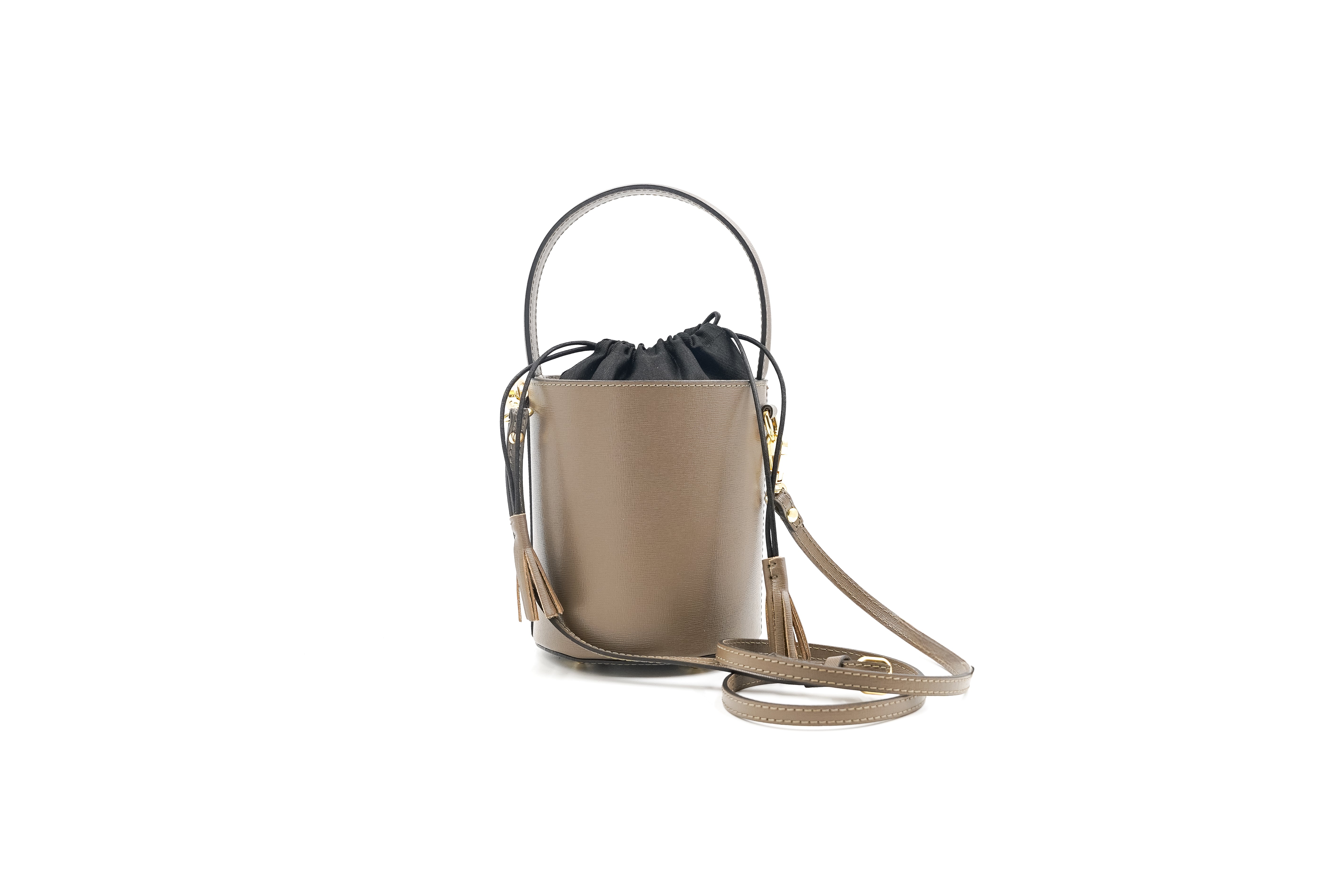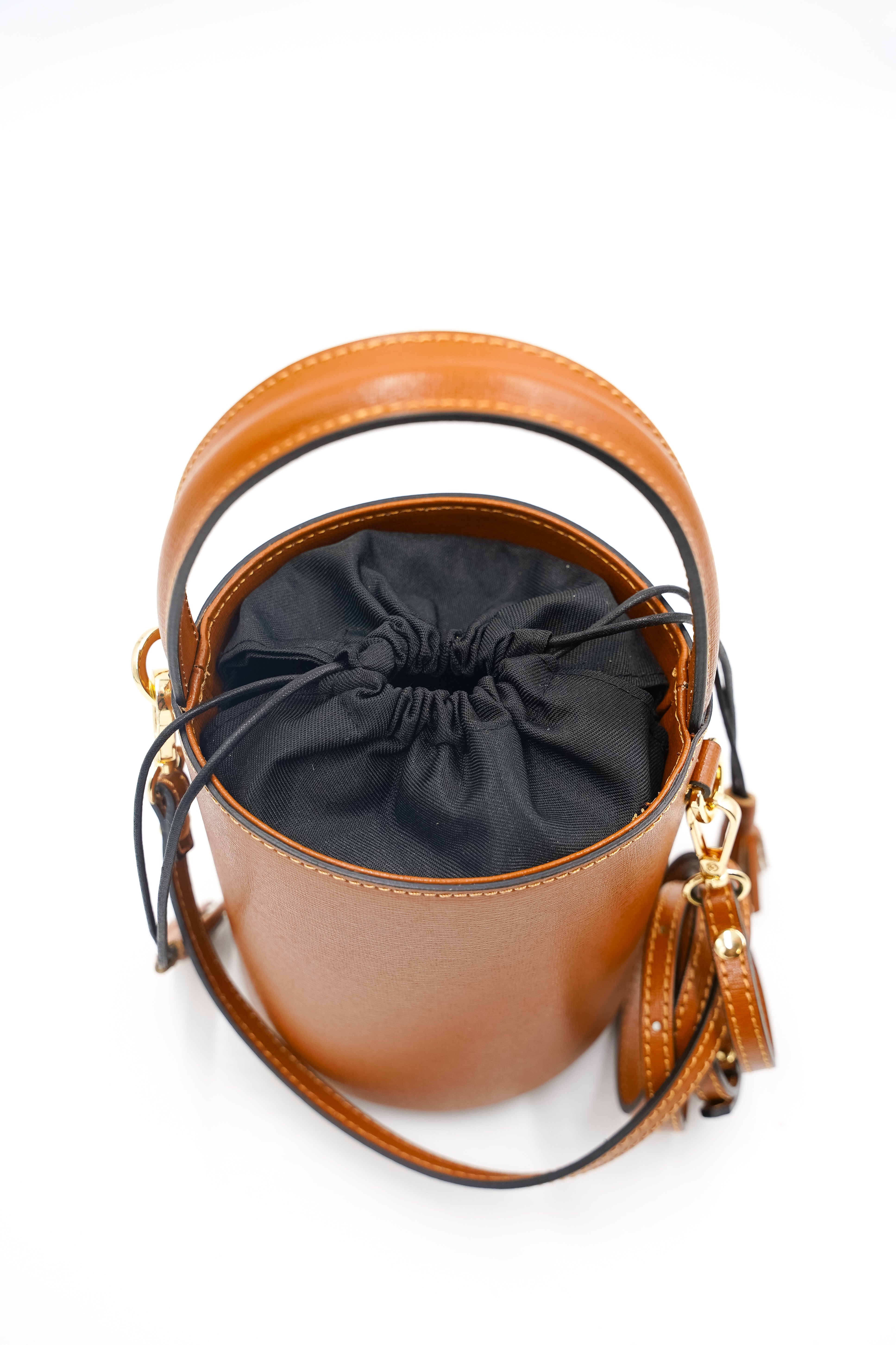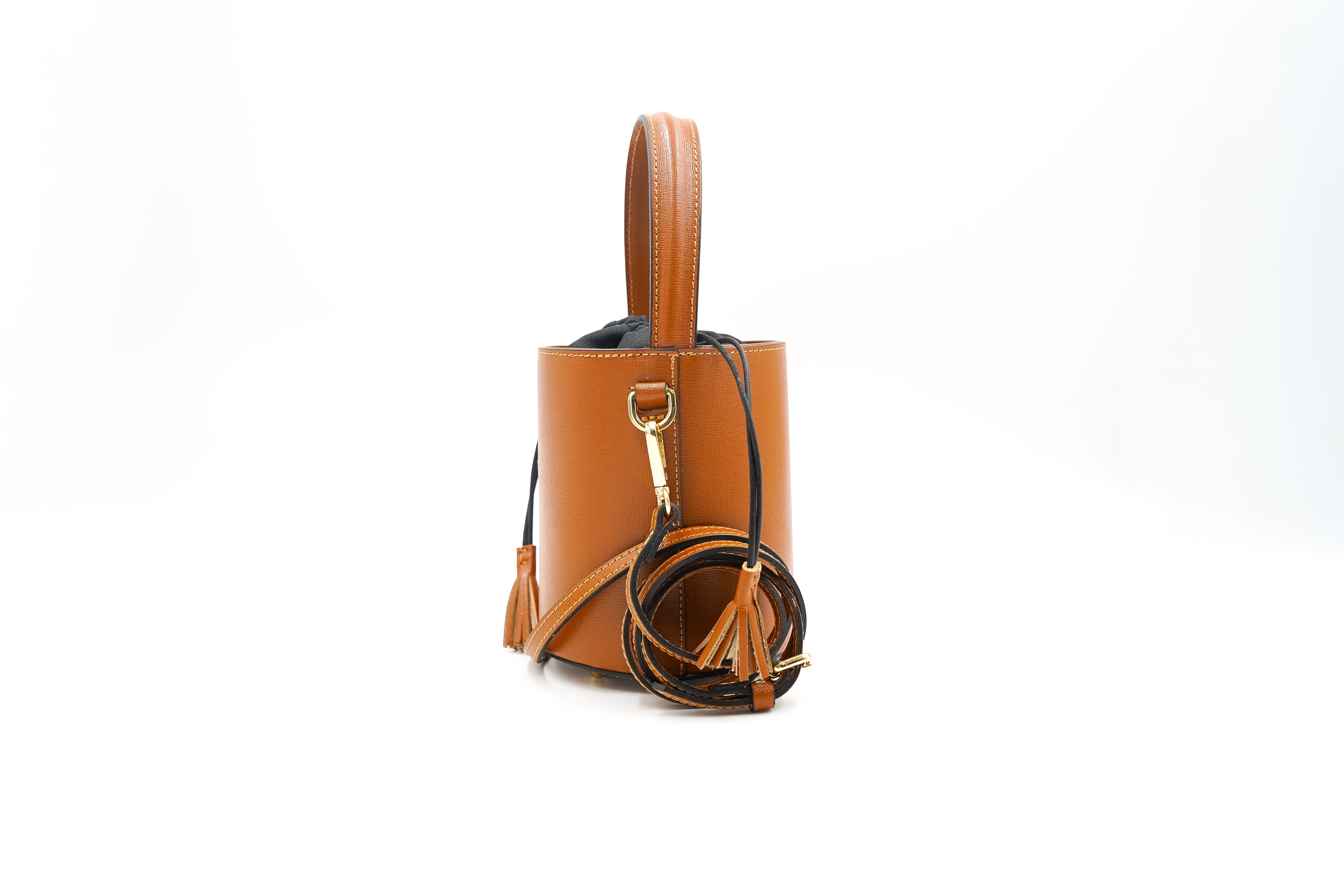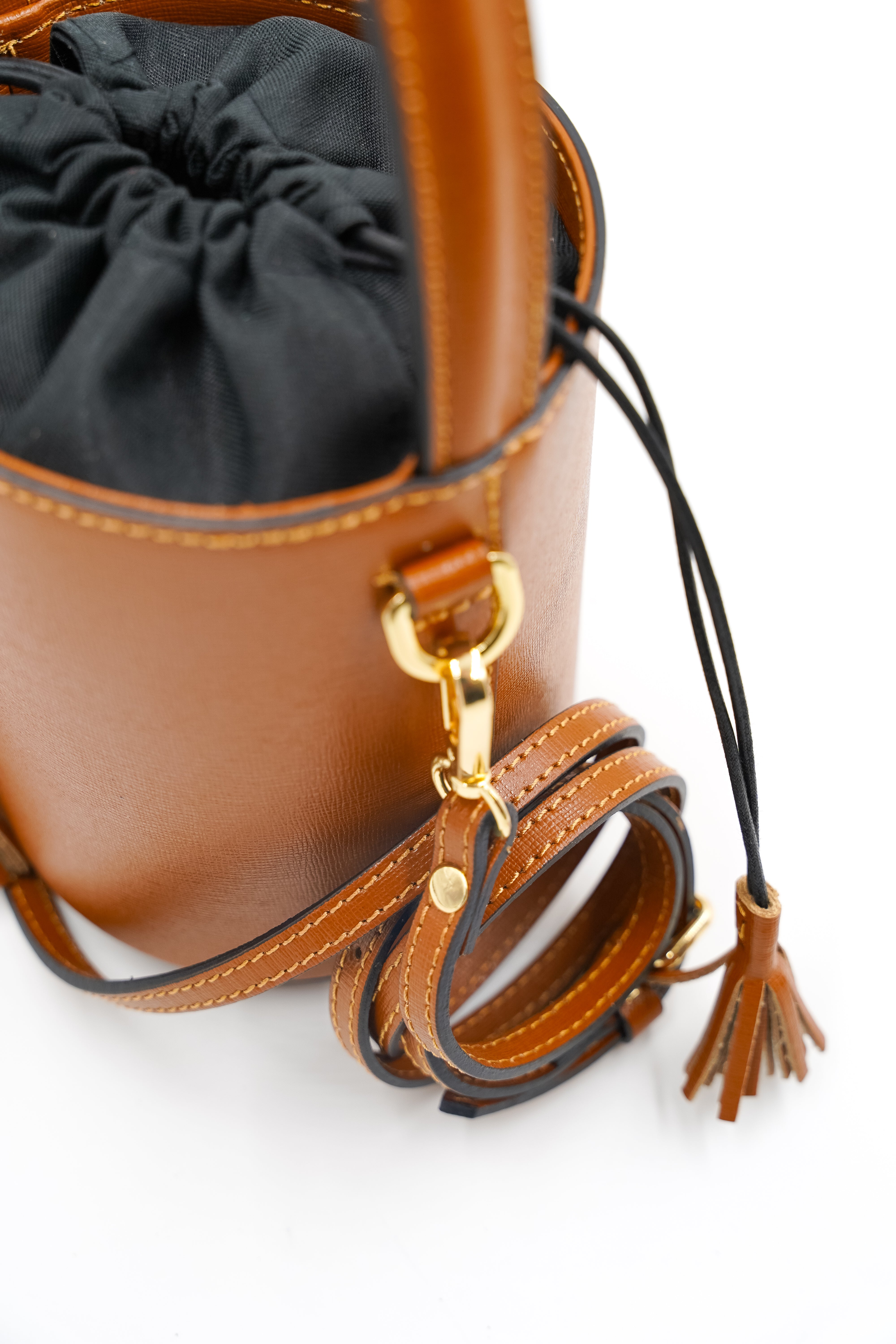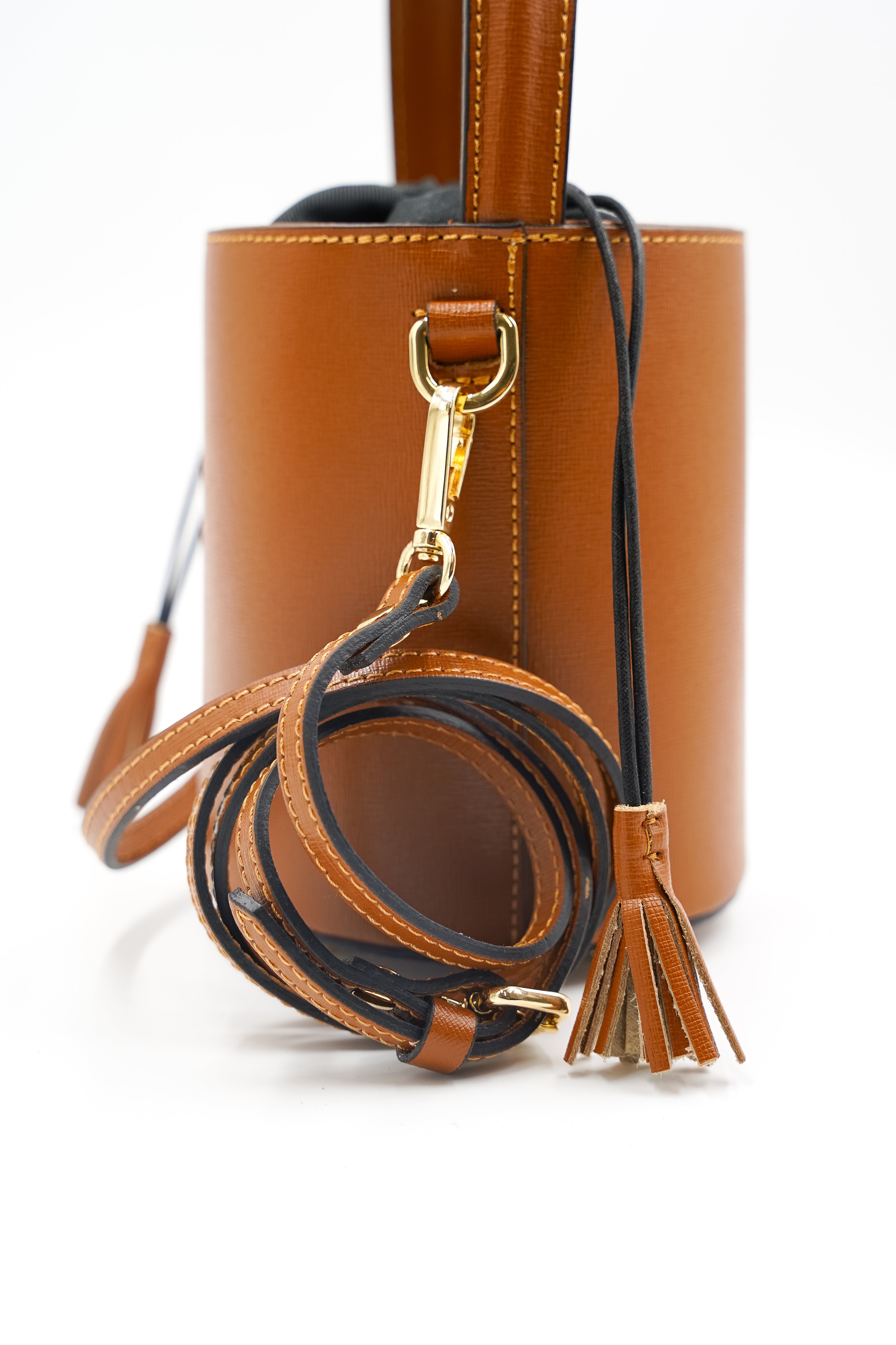 Questa borsa a secchiello è realizzata in vero  pelle liscia. Presenta una forma cilindrica strutturata, tracolla removibile e nappine decorative. Perfetta per l’uso quotidiano, dona un tocco di raffinatezza a qualsiasi look.