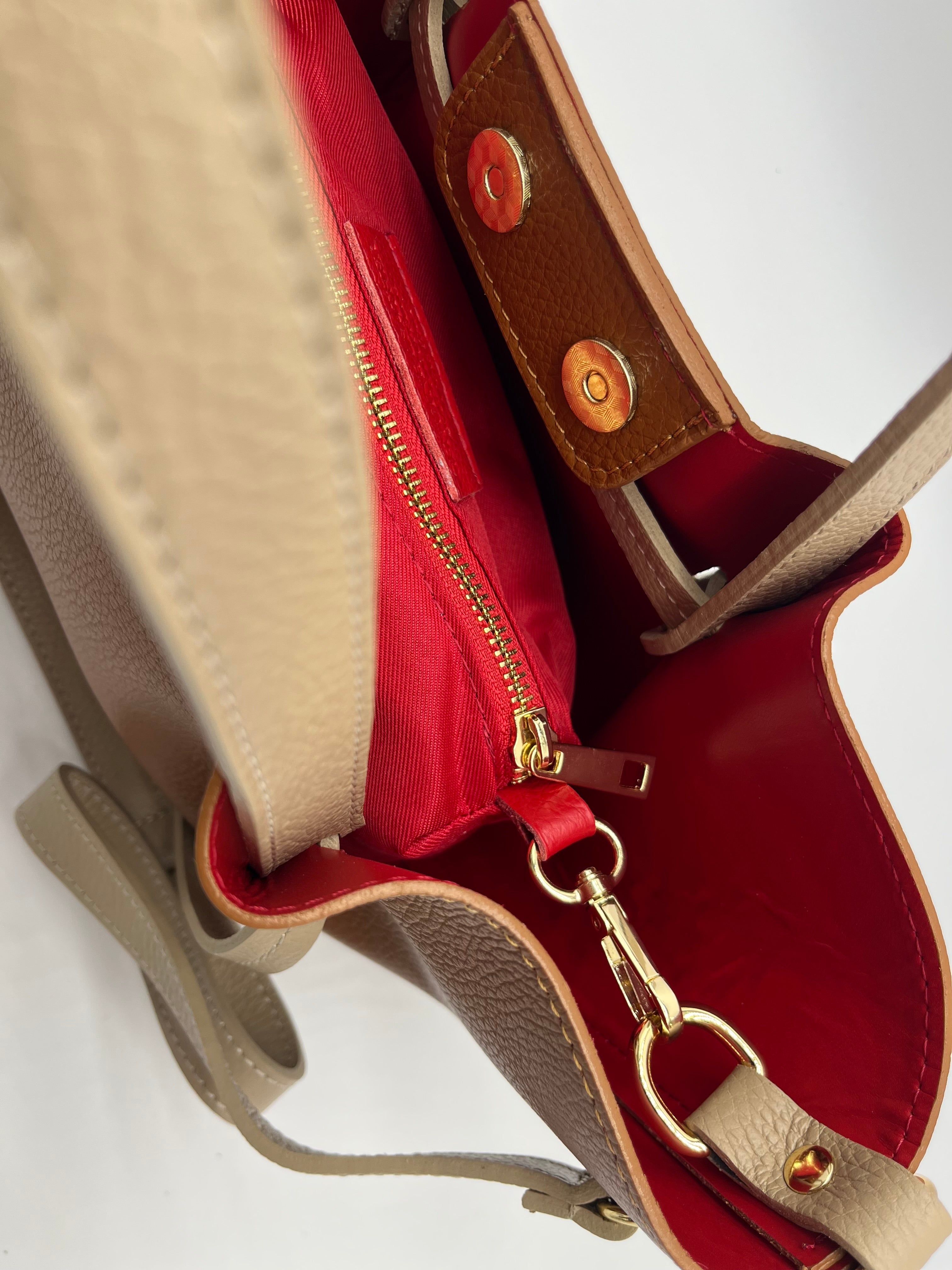 Dal carattere moderno e raffinato, con interni a contrasto e dettagli curati. La pochette removibile aggiunge un tocco di esclusività, mentre le tracolle intercambiabili offrono un’eleganza versatile e impeccabile.